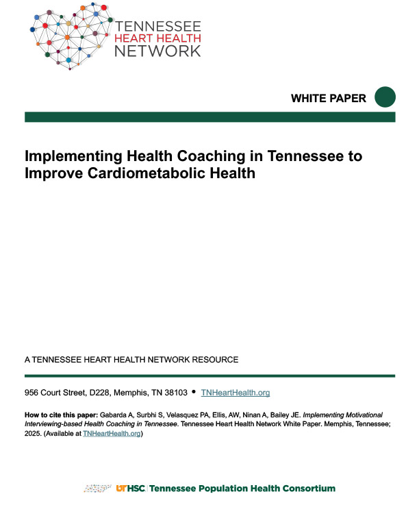 This white paper, developed by the Tennessee Heart Health Network Executive Council, its Population Health Subcommittee, and Tennessee Population Health Consortium staff provides an overview of the evidence supporting MI-based health coaching and its application within Tennessee. It highlights national trends, state-specific health challenges, and the role of health coaching in addressing chronic disease. The recommendations outlined here are designed to guide organizations in implementing scalable, patient-centered strategies that align with Tennessee’s population health priorities and provide a framework for Tennessee policymakers, health plans, and healthcare providers to improve care by implementing evidence-based health coaching programs. Click here to download.